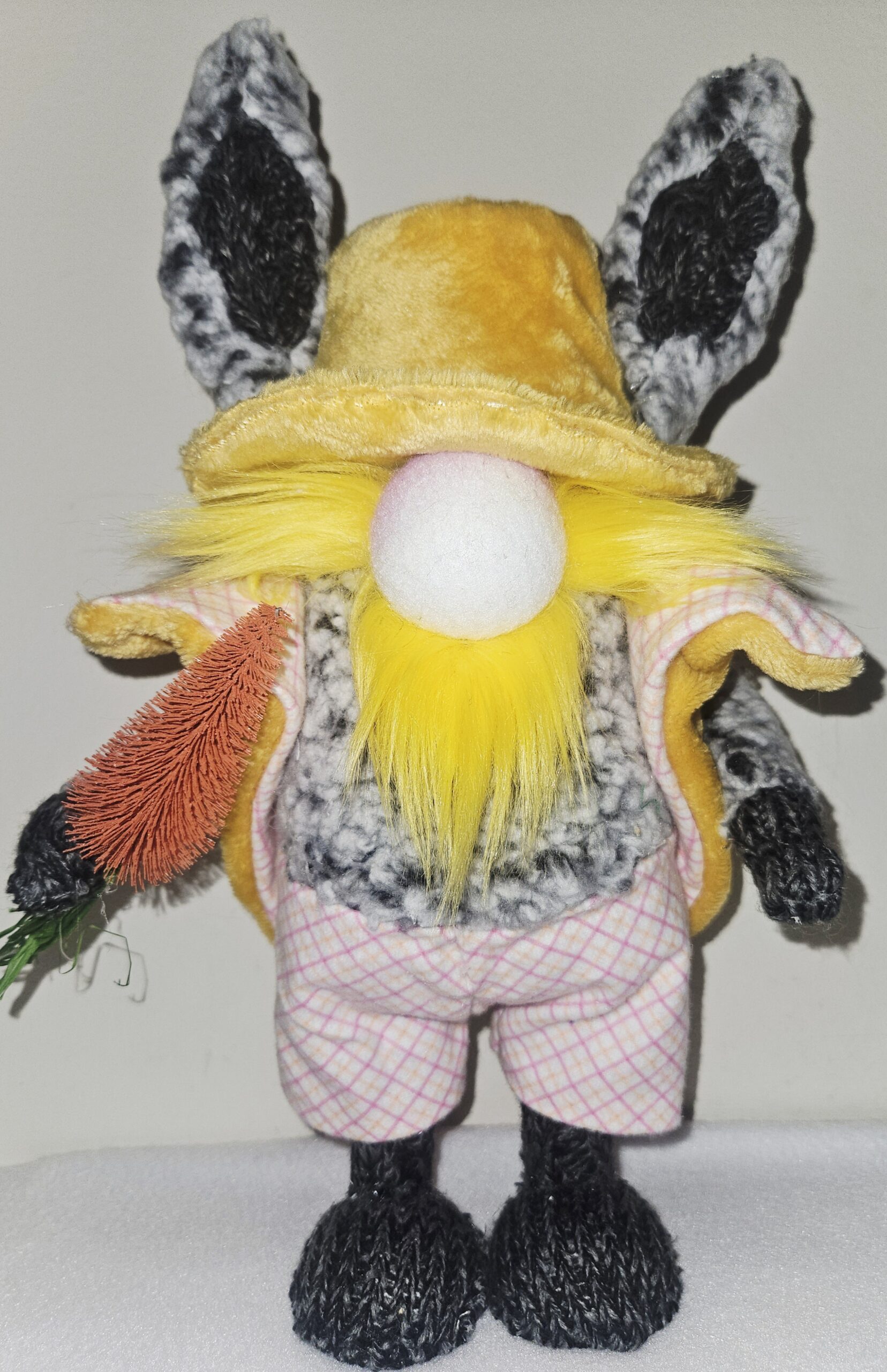 Meet Hopscotch, your cheerful little friend of springtime and smiles! This handmade 13.5-inch bunny gnome brings whimsical charm and seasonal joy into your home with every soft, colorful detail. Inspired by Scandinavian gnome folklore with a playful Easter twist, Hopscotch features tall bunny ears, a bright yellow beard, and a sweet round nose that peeks out from beneath his cozy hat.