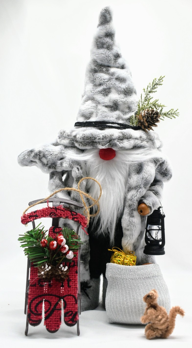 Bring the peaceful magic of the forest to your holiday décor with this charming Woodland Santa Gnome. Handcrafted with care and creativity, this rustic winter figure combines traditional Christmas warmth with cozy woodland charm. Dressed in a luxurious gray faux-fur robe and matching tall hat adorned with a pinecone and evergreen sprig, this gnome captures the serene beauty of a snowy forest.